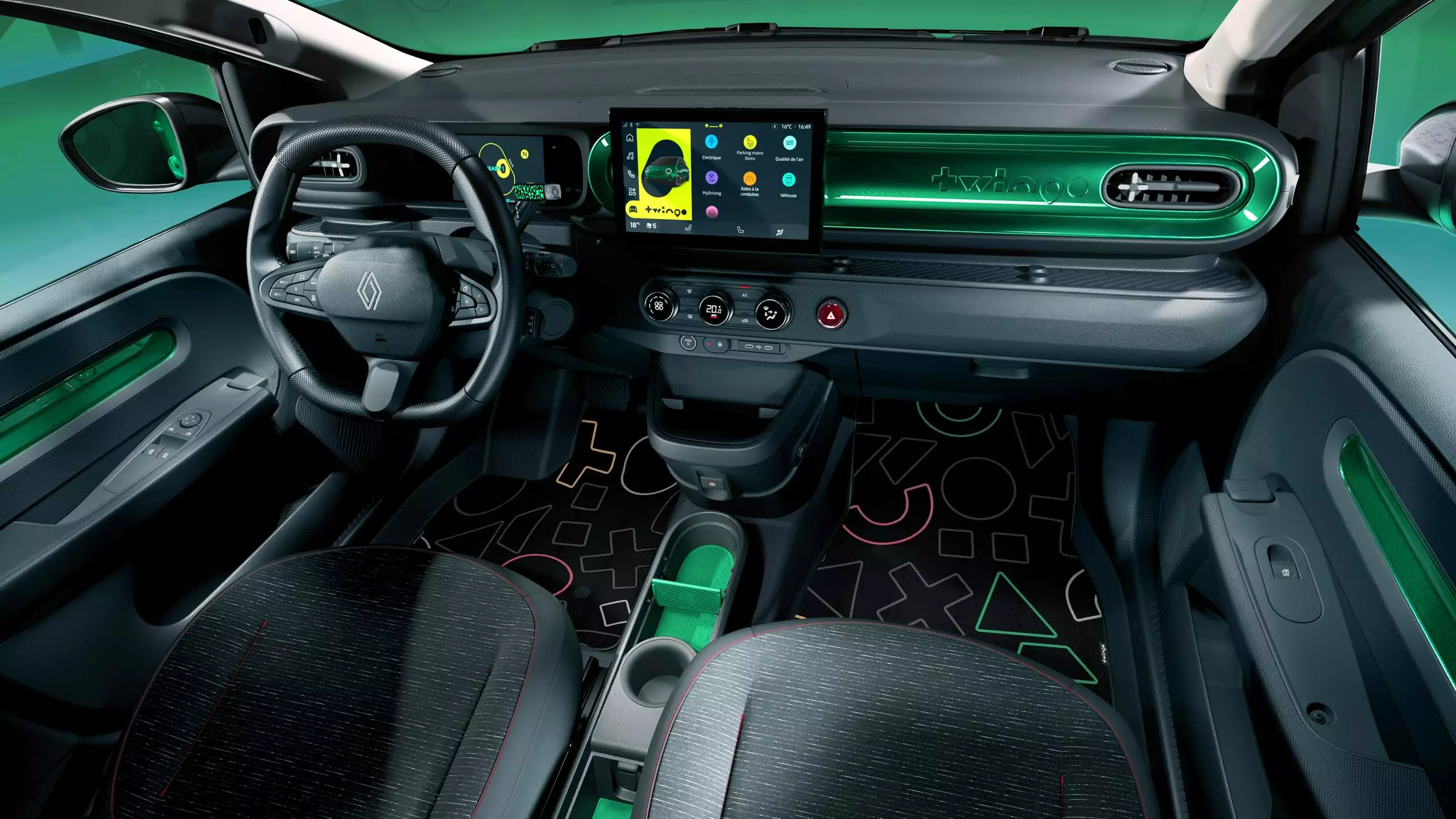 Renault ofrece una amplia gama de accesorios ingeniosos y coloridos que realzan el carácter alegre del Twingo E-Tech: consola central modulable, bolsa de compra plegable, separadores de consola o reposabrazos con compartimento. Su habitáculo, con detalles gráficos exclusivos, refuerza la personalidad divertida y única de este modelo urbano.